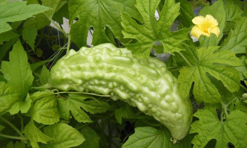 with the bitter melon fruit has a bulging body, shiny skin and dark green